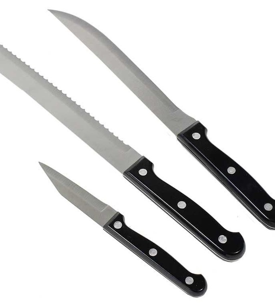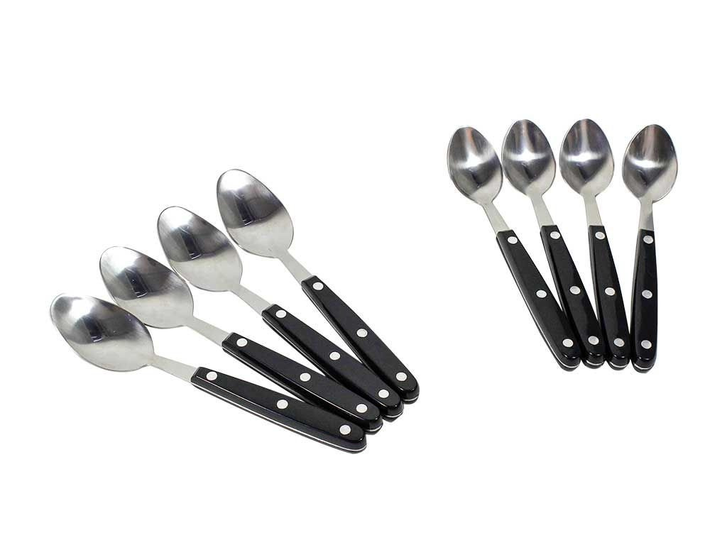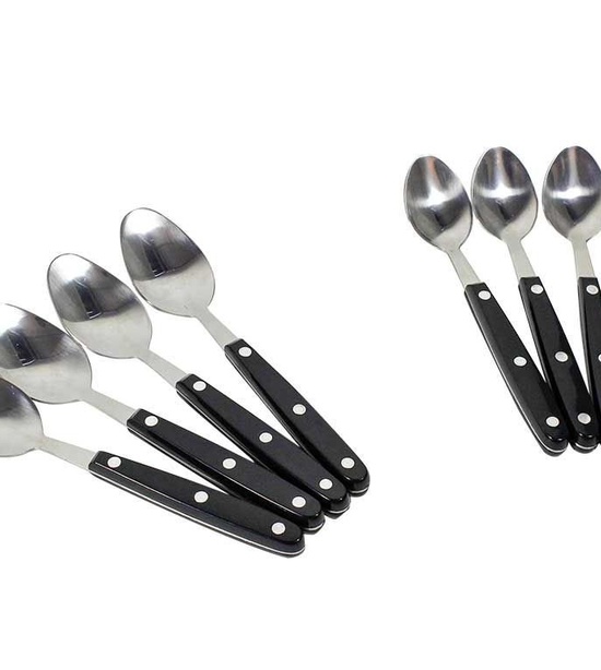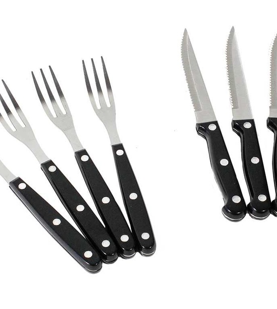 Trojité nitované rukoväte nožov s dvojito nitovanými vidličkami a lyžicami. Profesionálne kované nože s čiernou komfortnou rukoväťou. Steakové nože majú vysoko kvalitné, mikro-zúbkovanú čepeľ.