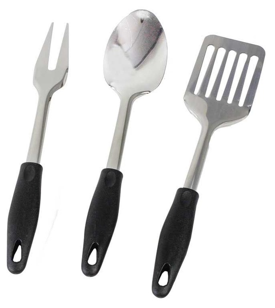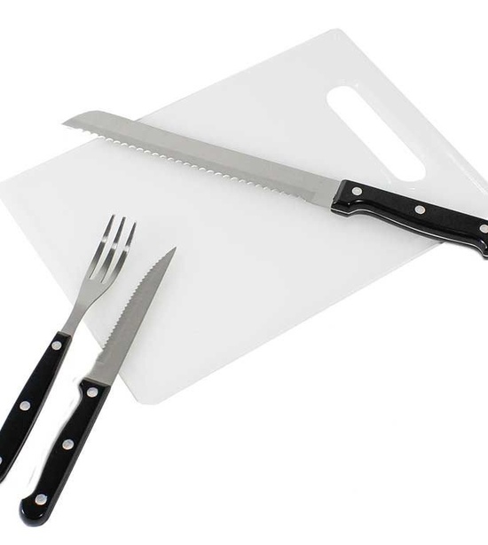 Obsahuje: 4 x zúbkované nože 4 x vidličky na steaky 4 x dezertná lyžica 4 x čajové lyžice 1 x krájacia doska 1 x odrezávací nôž 1 x nôž na chlieb 1 x rezací nôž 1 x naberačka 1 x obracačka 1 x vidlička BBQ / táborák 1 x otvárač na fľaše a vývrtka