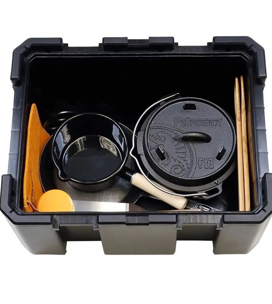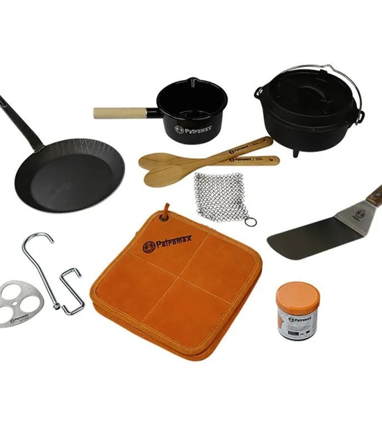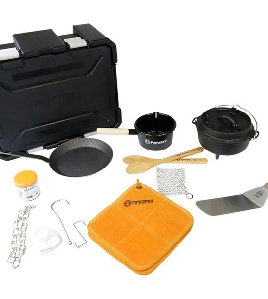 Jedná sa o dokonalú sadu na vonkajšie varenie. Obsahuje všetko, čo môžete potrebovať na prípravu raňajok, obeda i večere bez ohľadu na to, čo je na jedálnom lístku. Od steakov a vajec v panviciach z tepaného železa a smaltu až po dusené mäso, pečienky a pečenie v originálnej holandskej rúre Petromax. Súčasťou je aj rozsiahly a všestranný rad čistiaceho vybavenia a nástrojov na varenie.