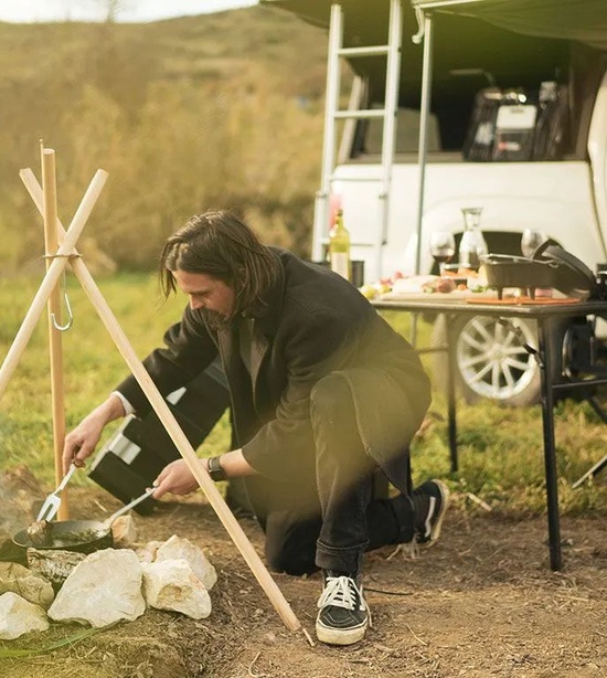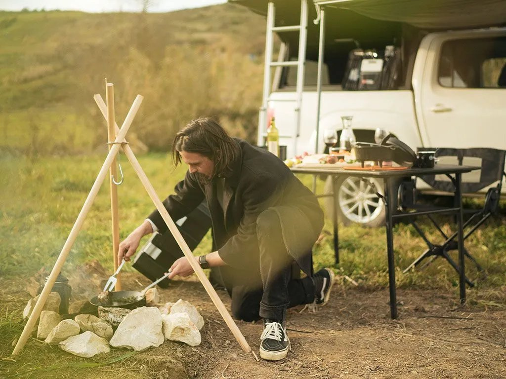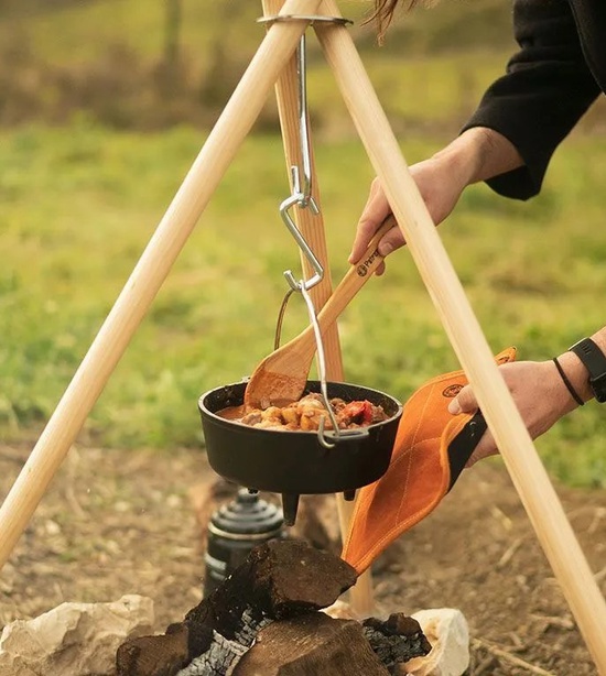 Ľahký Tripod držiak vám umožní vytvoriť okamžitú trojnožku, na ktorú môžete zavesiť holandskú rúru alebo kempingový kotlík.