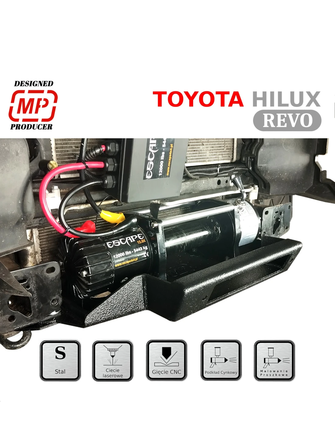Táto montážna platňa elektrického navijaka pre Toyota Hilux REVO 2020 je vyrobená z konštrukčného oceľového plechu s hrúbkou 5 a 6 mm, rezaného laserom a ohýbaného na digitálnom lise. Povrch platne je práškovo lakovaný dvojvrstvovým zinkovým základným náterom a čiernym práškovým náterom.