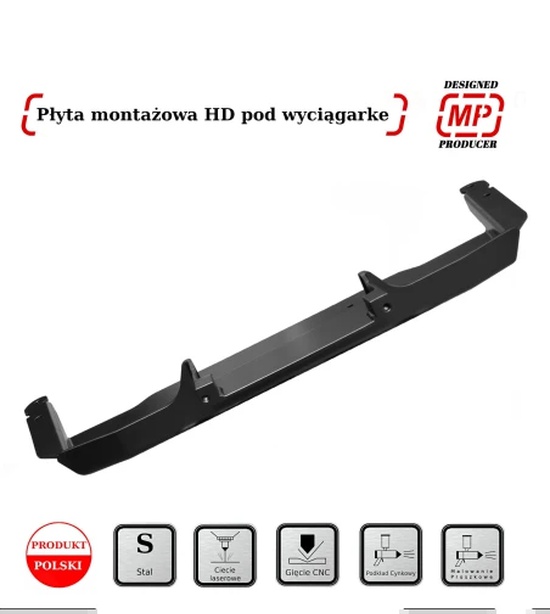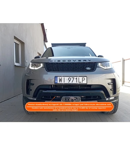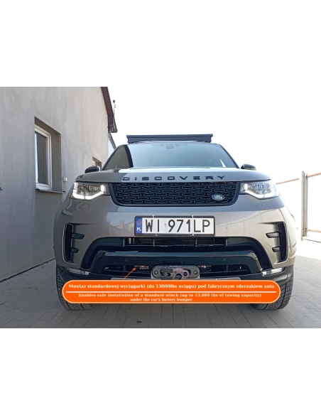 Montážna doska navijaka pre Land Rover Discovery V (2016-súčasnosť) Umožňuje bezpečnú montáž štandardného navijaka s ťažnou kapacitou až 6 000 kg pod nárazník vozidla z výroby. Doska je vyrobená z odolnej konštrukčnej ocele, čo zaisťuje vysokú odolnosť voči extrémnym terénnym podmienkam. Dvojvrstvový práškový náter: zinkový základný náter a práškový náter poskytujú dodatočnú ochranu proti korózii.