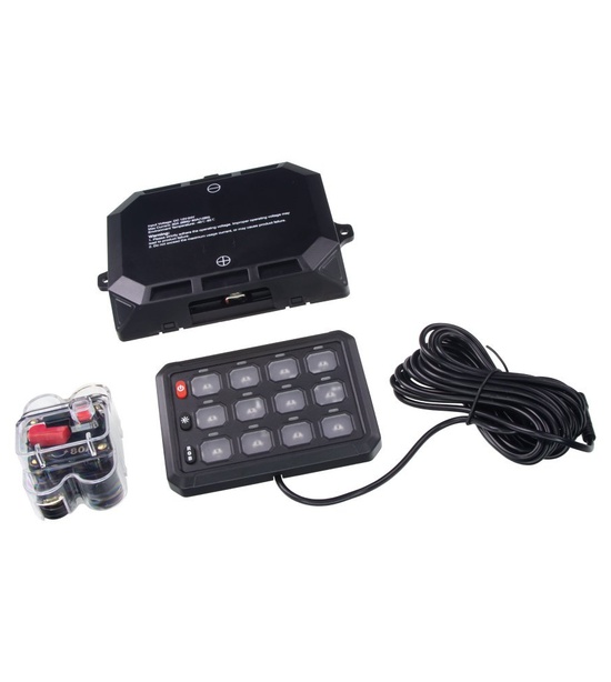 Multiprepínač s podsvietenými ovládacími tlačidlami umožňuje spínať 12 rôznych svetiel a iných zariadení s príkonom do celkových 80 A.