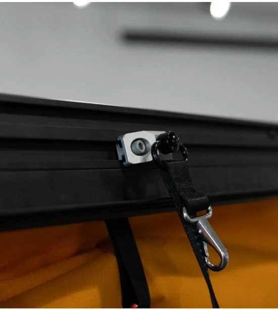Rýchloupínací otočný čap (QD swivel) sa zasúva do frézovaného hliníkového držiaka a nylonové lanko s niekoľkými pútkami zaistí pevný a pohodlný úchop. Celý systém sa jednoducho upevní na zadnú T-lištu pomocou dvoch T-matíc a skrutiek.