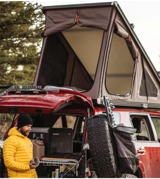 Nízky profil a ľahká konštrukcia: Stan má hrúbku iba 15 cm a hmotnosť 62 kg, čo minimalizuje odpor vzduchu a záťaž na vozidlo.