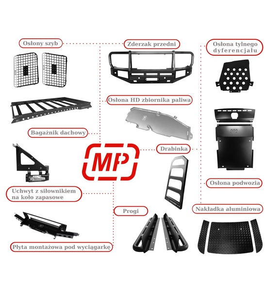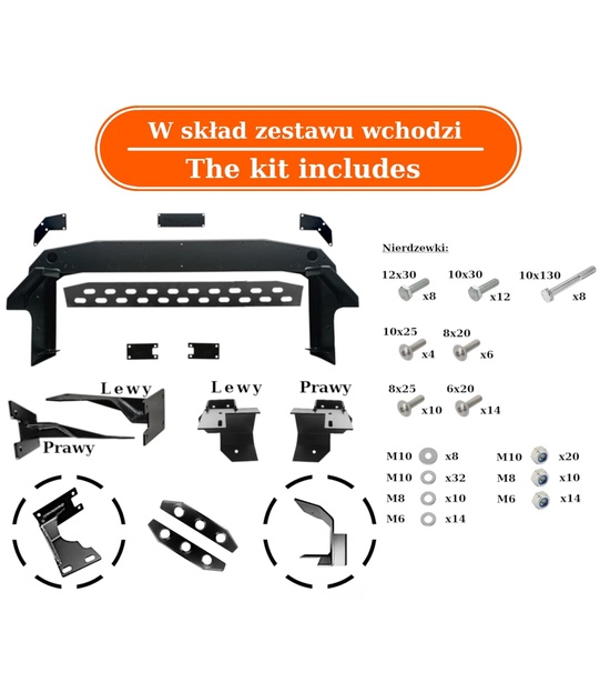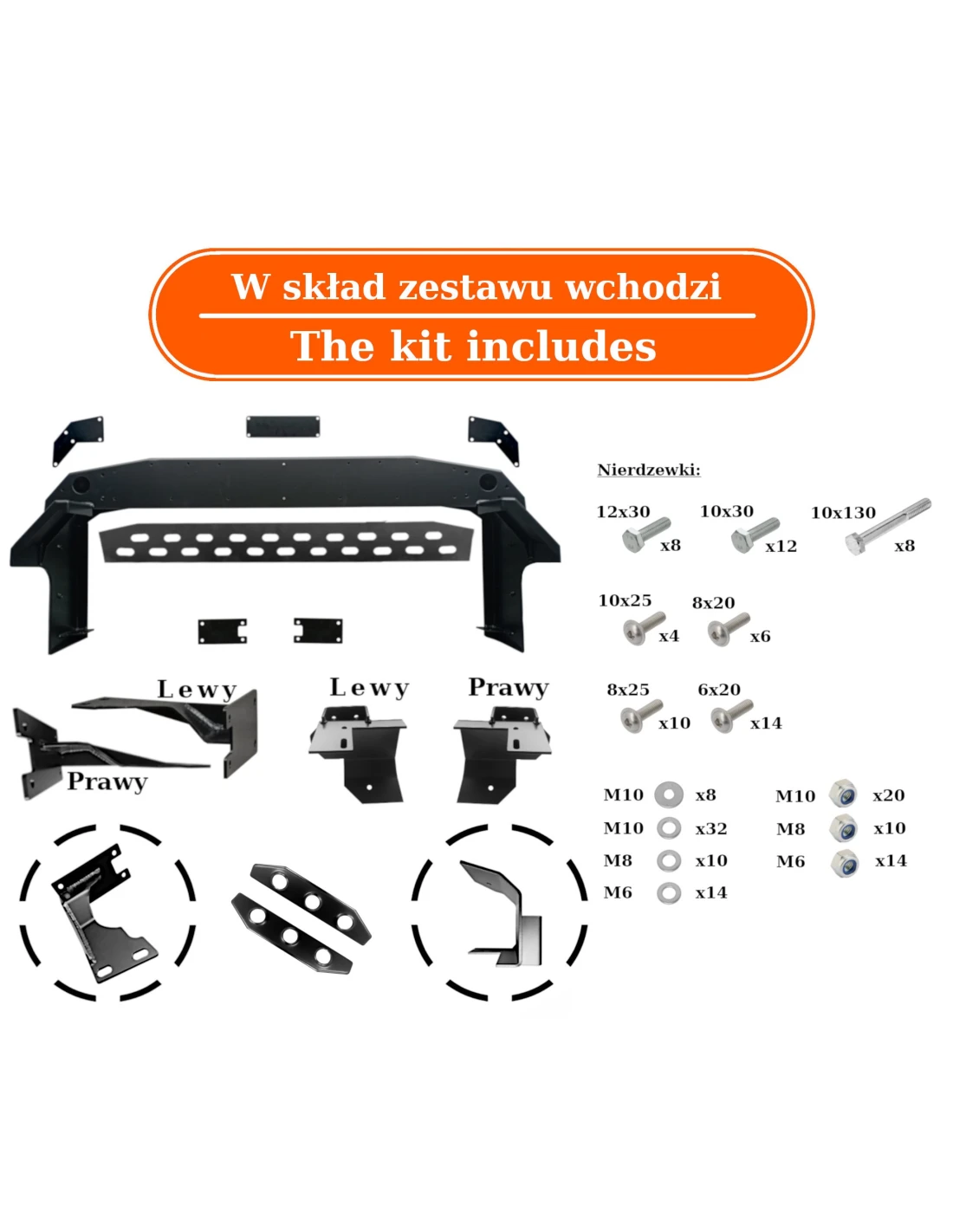 Súprava obsahuje: nárazník, hlavné montážne konzoly, bočné montážne konzoly nárazníka, dva bočné stojany a sadu montážnych skrutiek. Držiaky závesov zobrazené na fotografiách nie sú súčasťou balenia.